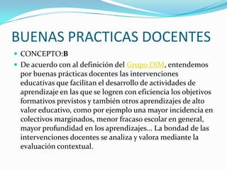 Las buenas prácticas docentes incluyen considerar las características de los estudiantes, definir objetivos claros y contenidos adecuados, y realizar una reflexión después de la intervención. Durante la intervención, el profesor debe desarrollar la enseñanza de manera flexible mediante interacciones lineales como la exposición o tutoría, e interacciones poligonales como el trabajo en grupo. No existe una única mejor práctica docente, sino que es importante enseñar conceptos básicos y destrezas para resolver problemas.