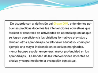 El documento describe las buenas prácticas docentes según un grupo de expertos. Define buenas prácticas como intervenciones educativas que logran objetivos formativos de manera eficiente y promueven aprendizajes valiosos. Describe las fases del proceso de enseñanza y aprendizaje, incluyendo la planificación, implementación y evaluación. Finalmente, discute cómo las tecnologías de la información y comunicación (TIC) pueden contribuir a facilitar los procesos educativos siempre que se utilicen de manera adecuada.