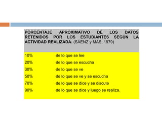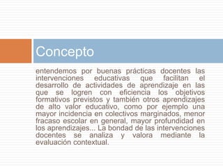 Las buenas prácticas docentes se refieren a intervenciones educativas que facilitan el aprendizaje y logran los objetivos formativos de manera eficiente. Un buen docente considera las características de los estudiantes, desarrolla la intervención con flexibilidad y realiza una reflexión posterior para mejorar. Las buenas prácticas utilizan diversas actividades como trabajos individuales, grupales, uso de nuevas tecnologías y evaluación continua para facilitar el aprendizaje significativo.