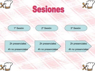 Este documento presenta un resumen del curso de cocina "Come y Calla" que consta de 3 sesiones presenciales y no presenciales. La primera sesión se centra en las técnicas básicas de cocina. La segunda sesión cubre más técnicas como cremas, pastas y ensaladas. La tercera sesión trata sobre postres tradicionales. Cada sesión incluye clases presenciales para poner en práctica los conocimientos y clases no presenciales en un blog con