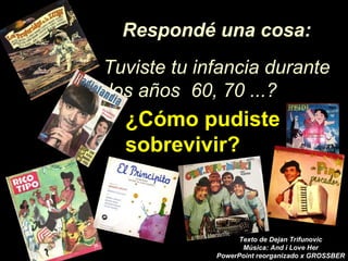 El documento describe la vida durante los años 1960 y 1970, cuando los niños tenían mucha más libertad y menos protecciones que hoy en día. Jugaban en la calle sin supervisión adulta, bebían agua sin tratar, y tenían juguetes y muebles poco seguros. A pesar de esto, la gente sobrevivió y desarrolló su personalidad. El documento invita a compartir estas memorias con generaciones más jóvenes.