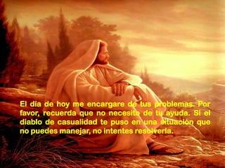 El documento aconseja al lector que no intente resolver problemas por su cuenta, sino que confíe en que Jesús se encargará de ellos. Sugiere poner los problemas "en la caja de Jesús" a través de la oración, y no aferrarse a ellos ni tratar de resolverlos uno mismo, para permitir que Jesús encuentre la solución a su tiempo. También ofrece rezar para asegurarse de que la solución que uno cree tener sea la correcta, y asegura que Jesús velará por el lector y estará disponible a través de la or