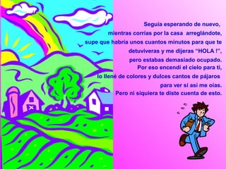 El documento describe cómo Dios observa y espera pacientemente al lector cada día, a pesar de que el lector está demasiado ocupado para notar la belleza de la naturaleza o tomarse un momento para hablar con Dios, quien lo ama incondicionalmente. Dios desea enseñar al lector sobre la paciencia y espera que algún día el lector tenga tiempo para reenviar el mensaje a otra persona.