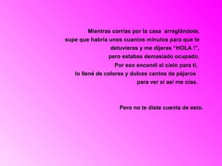 El documento expresa la tristeza de Dios al no recibir atención de una persona demasiado ocupada. A pesar de crear un hermoso amanecer, enviar una lluvia refrescante y embellecer el cielo nocturno, la persona no se dio cuenta de los gestos de Dios. A pesar de todo, Dios la ama y espera poder recibir una oración.