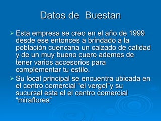 Este documento presenta un análisis y diseño de un sistema automatizado de facturación para la empresa de calzado Buestan. Buestan tiene locales en dos centros comerciales en Cuenca y busca mejorar su sistema de facturación. El documento describe los objetivos, la estructura organizacional, los procesos de facturación actuales y los campos requeridos para las tablas de clientes, productos y vendedores en la nueva base de datos automatizada.