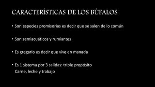 Este documento describe las características y usos de los búfalos. Los búfalos son especies promisorias que son semiacuáticas, rumiantes y viven en manadas. Pueden usarse para producir carne, leche y trabajo. La carne de búfalo es más roja y tiene mejor marmoreo que la carne de vaca. La leche de búfalo contiene más sólidos totales que la leche de vaca y se usa para hacer mozzarella. Los búfalos también pueden usarse para trabajos como cargar c