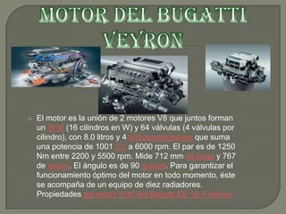El Bugatti Veyron es un automóvil superdeportivo producido por Bugatti desde 2005. Tiene un motor W16 de 1001 caballos de fuerza y alcanza una velocidad máxima de 407 km/h, siendo considerado por muchos como el mejor coche del mundo debido a su potencia, velocidad, tracción y lujo en su interior. Su elevado precio de 1.585.000€ lo hace un vehículo muy exclusivo.