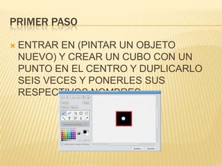 El documento describe un proyecto de cubitos que consiste en crear seis cubos duplicados con puntos en el centro y nombrarlos individualmente, organizar sus movimientos y controles, y crear un objeto para tirar los dados y determinar los resultados.