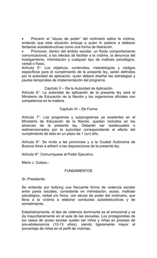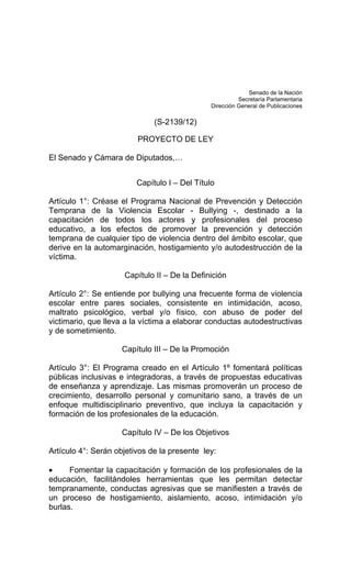Este proyecto de ley propone la creación de un Programa Nacional de Prevención y Detección Temprana de la Violencia Escolar, con el objetivo de capacitar a los profesionales de la educación para prevenir y detectar tempranamente cualquier tipo de violencia en el ámbito escolar, como el acoso o bullying, que puedan llevar a la automarginación o autodestrucción de las víctimas. El programa promovería también un mejor flujo comunicacional para facilitar la denuncia de casos de hostigamiento o maltrato.