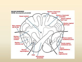 El documento describe la anatomía del bulbo raquídeo, incluyendo su localización, estructuras, funciones y vasculatura. Se divide en tres tercios que contienen diferentes núcleos y estructuras. El tercio superior contiene las olivas y núcleos del hipogloso, vago y vestibulares. El bulbo se continúa hacia arriba con la protuberancia y hacia abajo con la médula espinal, y recibe irrigación de las arterias vertebrales y cerebelosas posteriores.