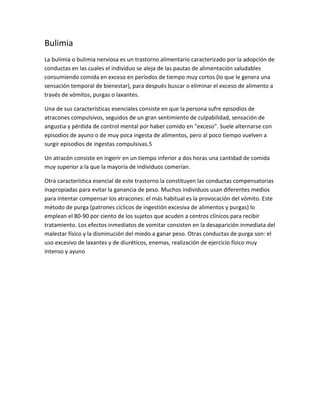 La bulimia es un trastorno alimentario caracterizado por atracones compulsivos de comida seguidos de sentimientos de culpa, y conductas compensatorias como el vómito o uso de laxantes para evitar la ganancia de peso. Las personas con bulimia alternan entre períodos de atracones y ayuno, sintiendo pérdida de control durante los atracones.