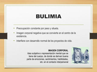Este documento describe la bulimia nerviosa, incluyendo sus características, factores de riesgo, diagnóstico, complicaciones y tratamiento. La bulimia se caracteriza por episodios recurrentes de atracones seguidos de comportamientos compensatorios como el vómito autoinducido. Afecta principalmente a adolescentes y mujeres jóvenes. Sus factores de riesgo incluyen presiones culturales sobre la delgadez y problemas familiares o de personalidad. Su tratamiento implica un enfoque interdisciplinario que aborde tanto los síntomas
