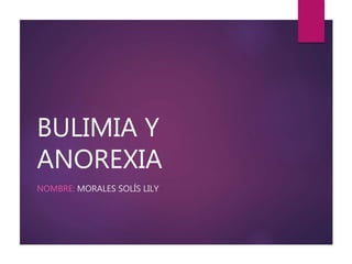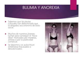 La bulimia y la anorexia son trastornos alimenticios complejos que se han convertido en un problema grave para los jóvenes en el país. La anorexia implica una pérdida de peso considerable y una imagen corporal distorsionada, mientras que la bulimia involucra atracones secretos seguidos de vómitos u otros comportamientos compensatorios. El documento describe los signos físicos y conductuales de ambos trastornos y enfatiza la importancia de un diagnóstico temprano para ayudar a los pacientes.
