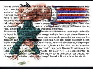 Alfredo Bullard analiza la importancia del análisis económico del derecho. Explica que el derecho afecta el bienestar individual y agregado, y que jueces honestos y normas predecibles contribuyen a una mejor economía. También señala que la propiedad intelectual, al igual que la propiedad tangible, es importante para el funcionamiento del sistema económico. Finalmente, indica que el derecho debe aplicarse con sentido común y analizando los costos y beneficios económicos, como se ilustra en el ejemplo de la viuda des