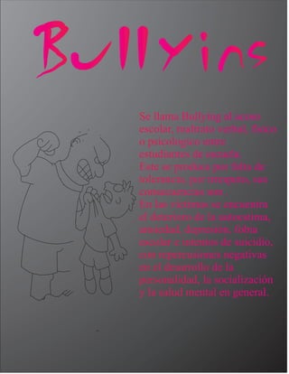 El bullying o acoso escolar se refiere al maltrato verbal, físico o psicológico entre estudiantes que ocurre debido a la falta de tolerancia y respeto. Esto puede tener consecuencias graves como deterioro de la autoestima, ansiedad, depresión y hasta intentos de suicidio en las víctimas, afectando negativamente su desarrollo personal, socialización y salud mental.