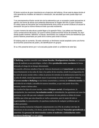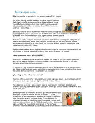 El documento habla sobre el acoso escolar o bullying. Explica que es cualquier forma de abuso psicológico, verbal o físico entre estudiantes de forma repetida. Menciona que el acoso emocional es el más común y suele ocurrir en las aulas y patios escolares, involucrando a niños de 12-13 años. También señala que el bullying puede durar desde días hasta años y tiene consecuencias negativas, por lo que es importante prevenirlo y resolver cualquier problema de forma oportuna.