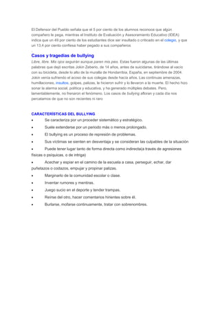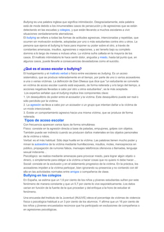 El bullying se refiere a la intimidación sistemática y repetida de uno o más estudiantes contra otro u otros. Puede incluir agresión física, verbal, psicológica o social. El bullying implica un desequilibrio de poder y la intención de causar daño a la víctima de forma reiterada. En España, se estima que entre el 1.6% y el 5% de los estudiantes sufren bullying de forma constante o esporádica, lo que puede llevar a consecuencias devastadoras como el suicidio.