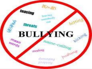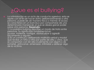 El bullying o acoso escolar se define como un comportamiento agresivo y deliberado que se repite en el tiempo y busca causar daño a otra persona de manera física o psicológica para ganar poder sobre ella. Puede tomar la forma de acoso verbal, físico o ciberacoso. Los casos descritos muestran cómo el bullying afecta negativamente a las víctimas y cómo los acosadores buscan sentirse poderosos para ocultar sus propias inseguridades.