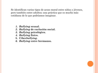 El bullying ocurre cuando niños o adolescentes son acosados continuamente por otros con más poder físico o estatus social, caracterizado por un abuso de poder y deseo de intimidar. Existen varios tipos de bullying, incluyendo sexual, de exclusión social, psicológico, físico y ciberbullying. Las causas del bullying incluyen modelos educativos que enseñan violencia e intimidación para resolver problemas, así como una ausencia de valores y límites.