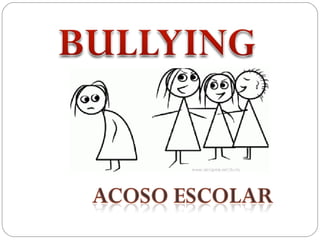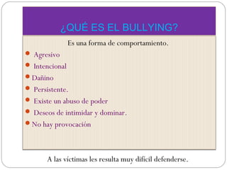 El documento define el bullying como un comportamiento agresivo, intencional y dañino que se da de manera persistente, donde existe un abuso de poder y deseos de intimidar y dominar a la víctima sin provocación. Afecta a la mayoría de los estudiantes y puede manifestarse de forma física, verbal o psicológica. Para detenerlo, es necesaria la denuncia y la participación de toda la comunidad escolar en proyectos y campañas permanentes contra el bullying.