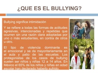 El bullying o acoso escolar se refiere a actitudes agresivas repetidas entre estudiantes. Puede ocurrir verbalmente, físicamente, a través de la exclusión social o cibernéticamente. Las causas incluyen factores personales, familiares y escolares. Las consecuencias para el agresor y la víctima incluyen baja autoestima, problemas de comportamiento y trastornos emocionales. Para prevenirlo, es importante que padres, maestros y escuelas trabajen juntos para crear un ambiente seguro y de apoyo.