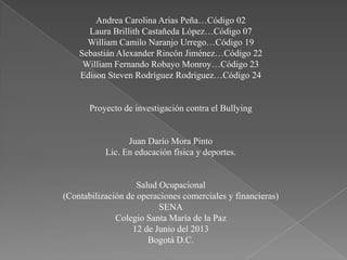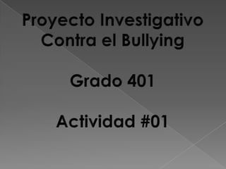 Este documento presenta un proyecto de investigación contra el bullying en un colegio en Bogotá, Colombia. Se identificaron 6 estudiantes que realizan bullying y 6 víctimas a través de encuestas y observaciones en el salón de clases. El objetivo es contribuir a la prevención de la violencia escolar de acuerdo con la ley colombiana.