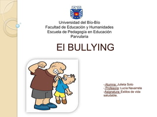 El documento habla sobre el bullying o acoso escolar. Define el bullying como cualquier forma de maltrato psicológico, verbal o físico entre estudiantes de forma repetida. Explica las causas del bullying, los tipos de bullying, las víctimas de acoso escolar y cómo prevenirlo. Concluye que el bullying destruye la autoestima de las víctimas y puede llevar a consecuencias graves, por lo que es importante crear un ambiente escolar de respeto y apoyo.
