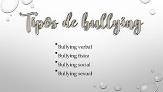 El bullying es un tipo de comportamiento violento e intimidatorio que se ejerce entre niños y adolescentes en la escuela a través de insultos verbales, agresiones físicas, aislamiento social y abuso sexual, afectando negativamente a la víctima. Existen cuatro tipos principales de bullying: verbal, físico, social y sexual.