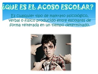 El documento define el acoso escolar como cualquier tipo de maltrato psicológico, verbal o físico entre estudiantes de forma repetida. Explica que el acoso escolar tiene como objetivo intimidar, someter y consumir emocional e intelectualmente a la víctima. Además, detalla los principales síntomas del acoso escolar en los estudiantes como miedo, tristeza, aislamiento social y problemas de concentración, y las medidas de prevención como la disciplina, atención al alumnado y no discriminación.
