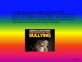 El documento define el acoso escolar o bullying como cualquier forma de maltrato psicológico, verbal o físico que se produce de forma reiterada entre escolares, ya sea en el aula o a través de redes sociales. Explica que el primero en utilizar el término "bullying" para referirse al acoso escolar fue Dan Olweus en la década de 1970. Además, describe los diferentes tipos de bullying, incluyendo el verbal, físico, psicológico, sexual y de exclusión social.