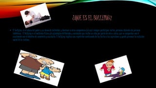 El bullying implica la intimidación y abuso físico o psicológico de un niño por parte de otros de forma repetida con el objetivo de someterlo y asustarlo. Puede ser físico, verbal, psicológico o social. Los padres deben estar atentos a cambios de comportamiento o humor en sus hijos que puedan indicar bullying. Para prevenirlo, es importante establecer reglas claras contra el bullying y supervisar a los estudiantes dentro y fuera del aula para actuar rápidamente ante cualquier caso.