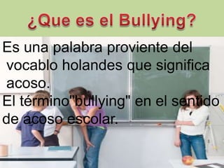 El bullying implica diferentes tipos de acoso como el verbal, físico y psicológico. Puede ocurrir en la escuela o en el hogar y tiene consecuencias negativas tanto para las víctimas como para los agresores. Las víctimas a menudo experimentan baja autoestima y problemas emocionales, mientras que los agresores suelen tener problemas en el hogar y buscan dominar a los demás. Es importante que las escuelas y familias aborden el bullying de manera rápida y contundente para prevenir estas situaciones.