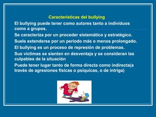 El documento define el bullying como el acoso sistemático y deliberado de una persona por parte de otra u otras, ya sea de forma individual o grupal, con el objetivo de someter o intimidar a la víctima. Se caracteriza por su continuidad en el tiempo y puede presentarse de forma directa o indirecta. Existen diferentes tipos de bullying como el verbal, físico, psicológico y de exclusión social. El bullying suele involucrar a acosadores, víctimas y espectadores.