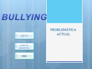El acoso escolar, también conocido como bullying, se refiere a todo tipo de maltrato entre estudiantes, ya sea físico, verbal o psicológico. Generalmente afecta a niños entre 10 y 15 años y puede tener consecuencias psicológicas graves como depresión o pensamientos suicidas para la víctima. El acosador suele ser alguien dominante que busca sentirse poderoso, mientras que la víctima es más bien sumisa e insegura. Una encuesta en Argentina encontró que 1 de cada 4 estudiantes entre 10 y 18 años