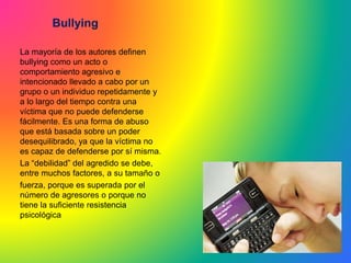 El documento describe los tipos de bullying y ciberbullying, incluyendo acoso directo e indirecto, y cómo afecta a las víctimas física y psicológicamente. También explica las diferencias entre bullying tradicional y ciberbullying, como el alcance más amplio, anonimato y falta de límites espaciales o temporales del ciberbullying. Finalmente, identifica siete categorías de violencia verbal y escrita a través de las nuevas tecnologías que constituyen formas de ciberbullying.