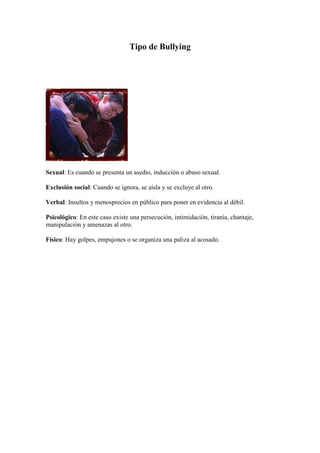 El documento describe los tipos de bullying, sus causas y consecuencias. Explica cómo deben actuar los padres, maestros y niños ante casos de bullying. Se describen las conductas típicas de agresores y víctimas, y se ofrecen recomendaciones para prevenir el bullying en la familia, escuela e instituciones.