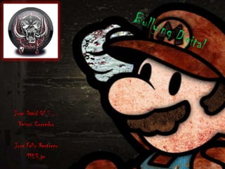 El documento habla sobre el acoso digital y el ciberbullying. Explica que personas entre 14 y 25 años son las más propensas a insultarse en las redes sociales. También menciona algunas causas comunes como publicar fotos íntimas o hacer comentarios arrogantes. Finalmente, propone suspender cuentas de usuarios que acosan y crear mecanismos para denunciar este tipo de comportamientos dañinos con el fin de que cesen en las redes sociales.