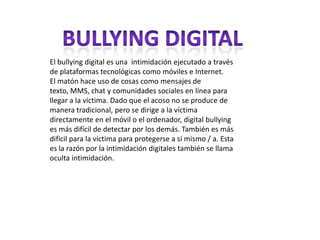 El bullying digital es una forma de intimidación que ocurre a través de plataformas tecnológicas como mensajes de texto y redes sociales. Se puede llevar a cabo de forma directa, indirecta, o robando la identidad de la víctima. A diferencia del acoso tradicional, el ciberacoso es más difícil de detectar y para que la víctima se proteja, y puede propagarse rápidamente causando gran angustia.