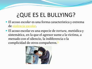Este documento discute el bullying y cómo manejarlo en el aula. Explica que el bullying es una forma de violencia escolar que involucra acoso sistemático de un agresor hacia una víctima. Proporciona un cuestionario para evaluar el bullying y los resultados de su aplicación en 778 estudiantes. Además, ofrece estrategias para prevenir el bullying como establecer normas claras, fomentar la empatía y reforzar conductas positivas. También recomienda medidas individuales como hablar con la víctima, los agresores y sus