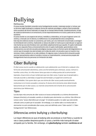 El documento define el acoso escolar o bullying como cualquier forma de maltrato psicológico, verbal o físico entre estudiantes de forma repetida. El acoso escolar se caracteriza por la intimidación de la víctima por parte de un agresor más fuerte y suele causar consecuencias psicológicas en la víctima. El ciberacoso ocurre cuando los estudiantes usan Internet u otras tecnologías para amenazar o humillar a otros, y puede ocurrir de forma anónima o con un cómplice. La principal diferencia entre el bullying tradicional y