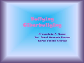 El documento describe los tipos de bullying, incluido el ciberbullying. Define el bullying como un comportamiento agresivo repetido contra una víctima que no puede defenderse. Explica que el bullying puede ser directo o indirecto. También describe las consecuencias negativas del bullying para las víctimas como baja autoestima y depresión. Define el ciberbullying como el envío de mensajes o imágenes dañinas en internet y explica cómo funciona a través del ordenador y el teléfono móvil. Finalmente, destaca las diferencias entre el bullying tradicional y