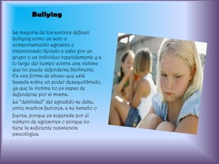 El documento describe los tipos de bullying, incluido el ciberbullying. Define el bullying como un comportamiento agresivo repetido contra una víctima que no puede defenderse. Explica que existen dos formas de bullying: directo e indirecto. También describe las consecuencias negativas del bullying para las víctimas como baja autoestima y depresión. Define el ciberbullying como el envío de mensajes o imágenes dañinas a través de Internet u otros medios digitales, y explica cómo funciona a través del ordenador y el teléfono móvil.