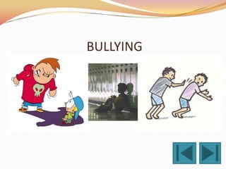 El documento describe los diferentes tipos de bullying, incluyendo bullying físico, verbal, psicológico y cyberbullying. El bullying se caracteriza por un desequilibrio de poder donde una persona intimida y daña a otra de forma repetida. Esto puede causar daños físicos y emocionales en la víctima como baja autoestima y problemas de aprendizaje. El bullying también afecta a los observadores al normalizar la violencia.