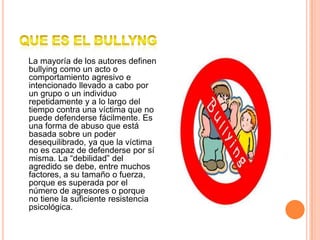Este documento describe el bullying y el cyberbullying. Define el bullying como actos agresivos repetidos contra una víctima que no puede defenderse. Explica que hay dos formas de bullying: directo e indirecto. También describe cómo afecta el bullying a las víctimas física y psicológicamente. Define el cyberbullying como una forma de acoso verbal y escrito a través de medios electrónicos que puede ocurrir en cualquier momento. Finalmente, destaca siete diferencias clave entre el bullying tradicional y el cyberbullying.