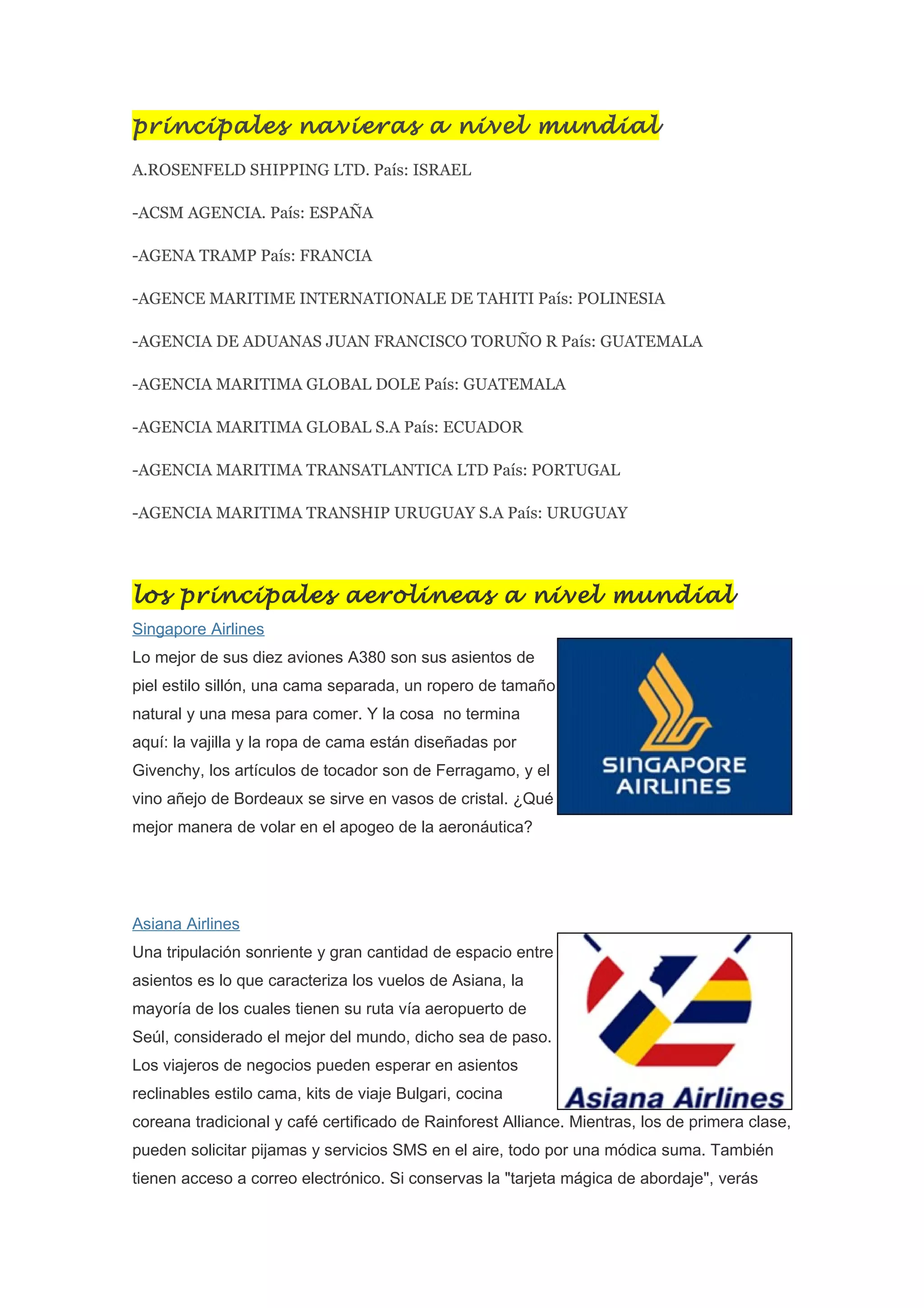 El documento proporciona información sobre las principales aerolíneas y empresas de transporte terrestre de carga a nivel mundial y en Colombia. Describe las características de los principales tipos de buques de carga, incluidos buques de contenedores, buques de carga refrigerada, buques de carga general y buques cisterna. También proporciona detalles sobre los aviones Airbus 319, 320, 321, 330, 340 y Boeing 737, 777 en términos de su capacidad de carga.