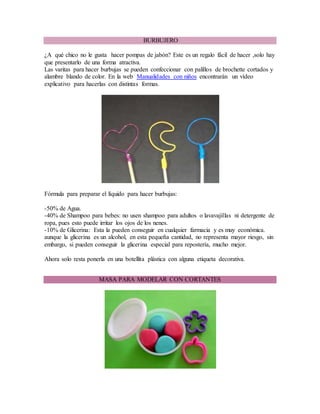 Este documento proporciona instrucciones para hacer varios regalos para niños, incluyendo varitas para hacer burbujas, masa para modelar y un porta CD. Incluye recetas para el líquido de burbujas y la masa, así como sugerencias para presentar y almacenar los productos terminados.