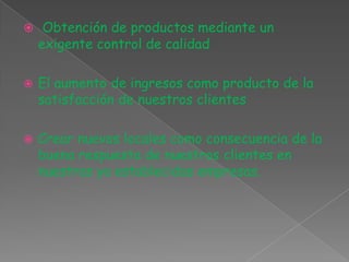 El objetivo principal de Burger King es satisfacer a los clientes ofreciendo productos de alta calidad. Buscan aumentar las ganancias y abrir nuevos locales como resultado de la lealtad de los clientes satisfechos. Sus instalaciones se diseñan teniendo en cuenta al cliente y cumplen con los más altos estándares de calidad y trabajo para brindar una buena experiencia a los clientes.