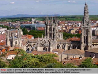 Burgos es una ciudad española conocida por su rica arquitectura medieval. Su monumento más famoso es la Catedral de Santa María, construida entre 1221 y 1280 en estilo gótico. Otras atracciones notables incluyen el Arco de Santa María, una antigua puerta de acceso a la ciudad del siglo XIV, y la Plaza Mayor, el centro histórico de la ciudad. Burgos ofrece muchos otros ejemplos de la arquitectura gótica, renacentista y barroca que ilustran su rica historia.