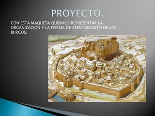 La maqueta representa la organización y forma de asentamiento de los burgos medievales con espacios para viviendas, comercio y murallas, utilizando materiales como cartón paja de colores y silicona líquida.