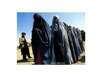 El documento describe las duras restricciones que enfrentan las mujeres afganas bajo el régimen talibán, incluyendo la prohibición de salir solas, trabajar o recibir educación. También no se les permite recibir atención médica a menos que sea en hospitales en pésimas condiciones, y los doctores solo pueden atender a hombres. Dar a luz implica grandes riesgos debido a la prohibición de ir a doctores varones. El adulterio se castiga con lapidación, arrojando piedras a la mujer enterrada hasta